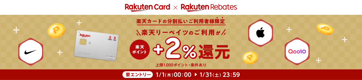 キャンペーン開催期間中に、楽天カードの分割払いをご利用すると楽天リーベイツでのお買い物対象期間の合計金額に+2.0% 特典ポイントを進呈します。(上限 1,000 ポイント)